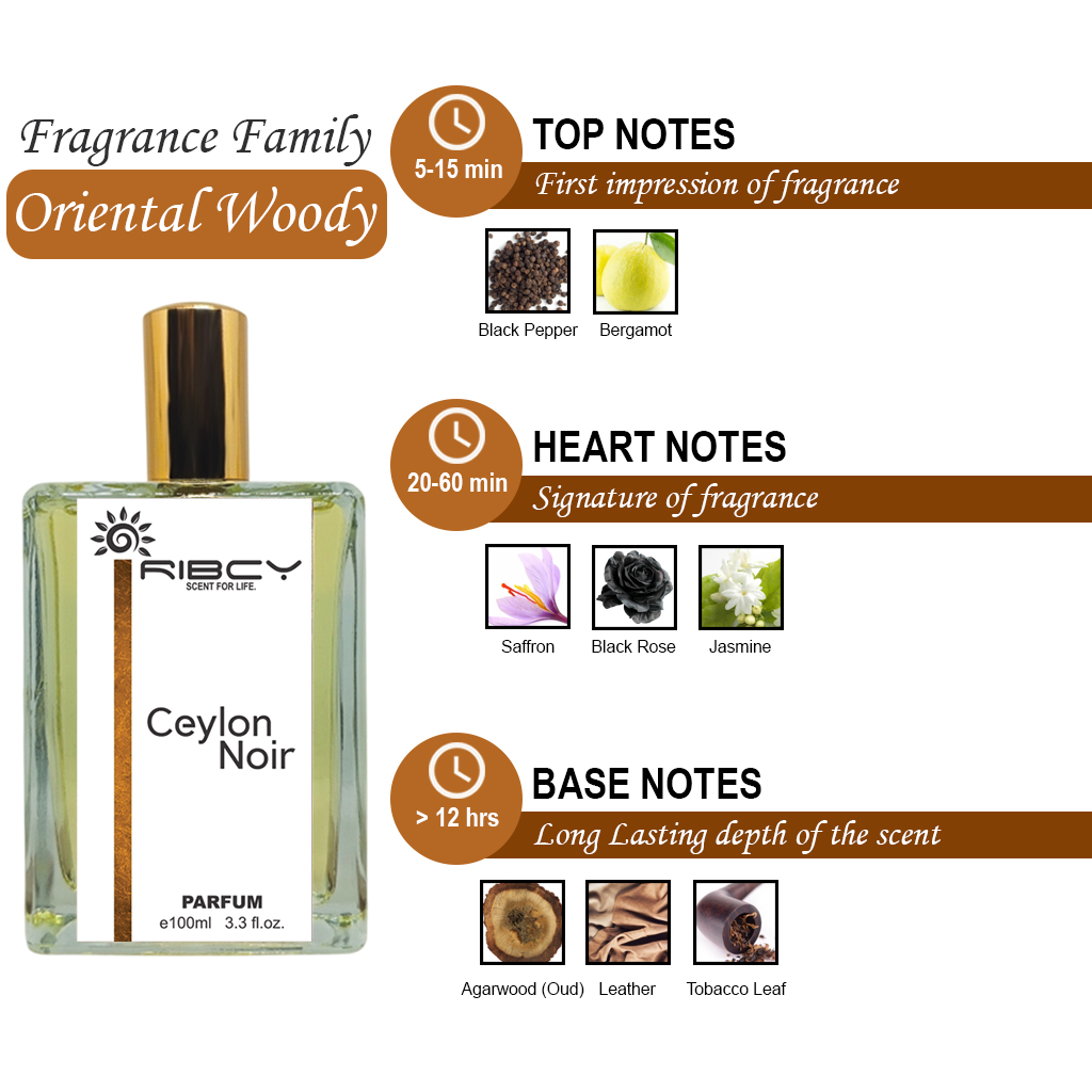 The true intensity of Ceylon Noir is revealed in its base—a powerful and long-lasting blend of masculine accords. It settles into a smoky, luxurious foundation of pure Agarwood (Oud), rich Tuscan Leather, and warm Tobacco Leaf. This trio of profound notes ensures an authoritative, magnetic sillage that lasts all night. Choose ribcy Ceylon Noir for a statement-making, high-performance fragrance that projects confidence and unmistakable luxury.