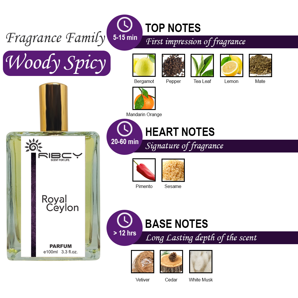 As the journey settles, Royal Ceylon finds its grounding in a deeply masculine and long-lasting foundation. The base is an earthy, rugged blend of Peruvian Cedarwood, smoky Vetiver, and smooth White Musk. This rich, woody dry-down provides a confident, enduring trail that mirrors the steadfast determination of the explorer. Wear ribcy Royal Ceylon to channel your inner adventurer and leave a memorable impression of spirited freedom and refined masculinity, perfect for daytime and casual settings in all seasons.