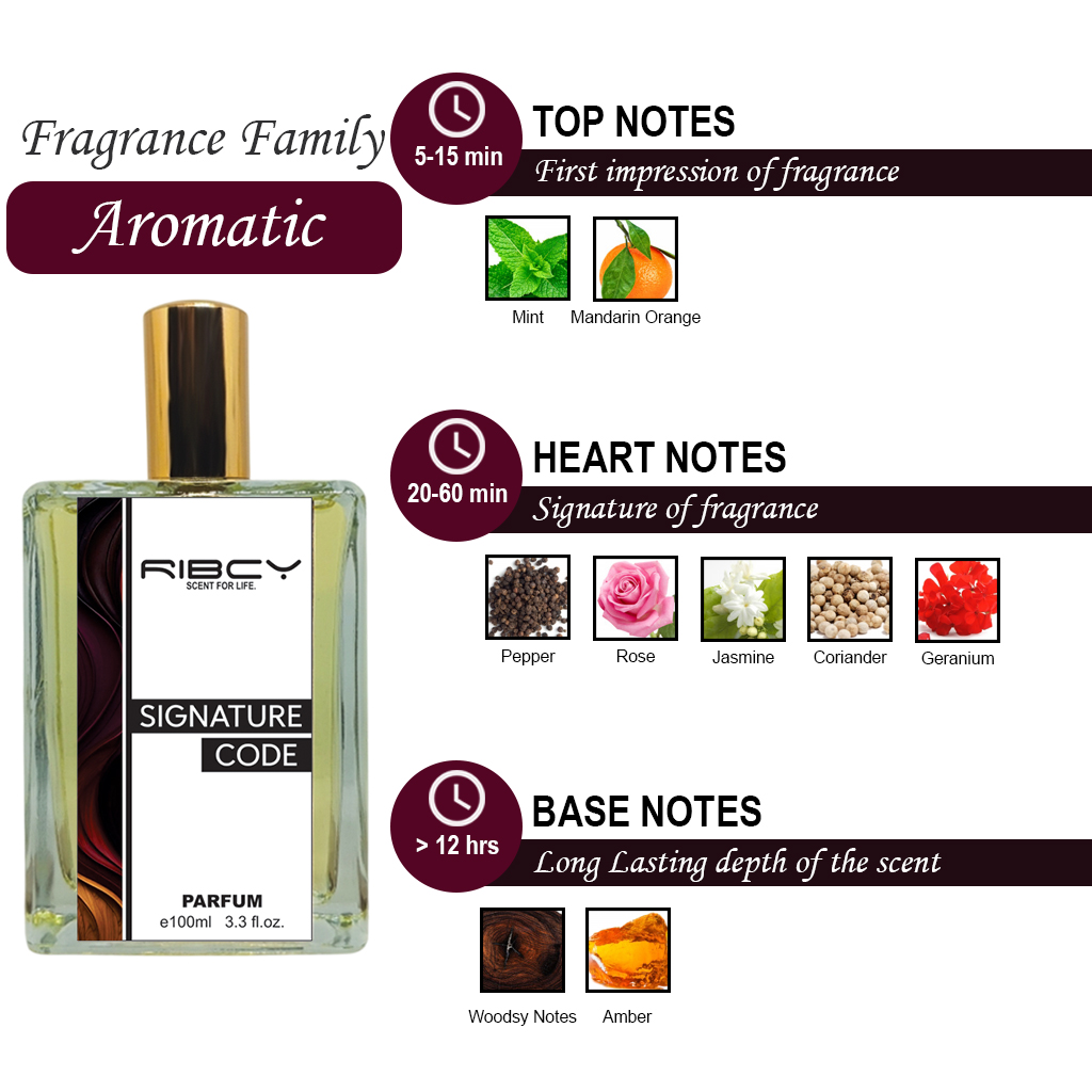 At the heart of Signature Code, a sophisticated blend of floral notes and warm spices creates a captivating depth that is both approachable and intriguing. Ribcy has crafted this layer to transition seamlessly from the initial brightness into a more resonant, soulful experience. The aromatic spice notes add a touch of mystery, while the floral undertones ensure the scent remains smooth and balanced. It is a composition that speaks to versatility, making it the ideal companion for the man who moves effortlessly between different worlds and social circles.